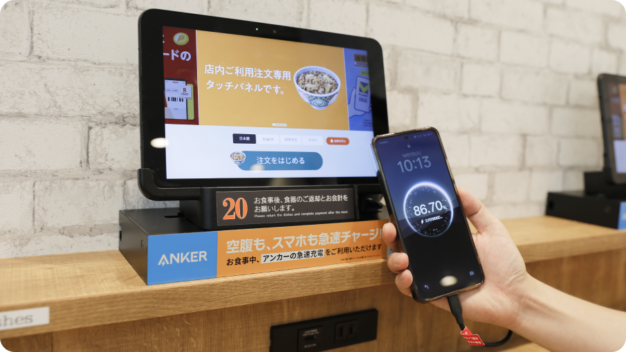 食事の時間にスマートフォンを急速充電できる環境を提供することで、吉野家店舗での顧客満足度の向上と新たな来店動機の創出を図っています。