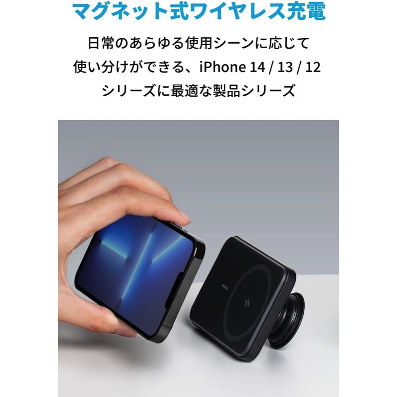 従来モデルより約30%の薄型化を実現し、財布やバッグ等に収納することが可能。5000mAh容量かつ7.5W出力でiPhone 13 / 12シリーズへ約1回充電が可能です。 (※PopSockets部分を除く。Anker PowerCore Magnetic 5000との比較。iPhone 13 / iPhone 13 Pro / iPhone 13 Pro Max / iPhone 12 Pro Maxへの満充電回数は1回未満になります。充電回数はAnker調べ) 。