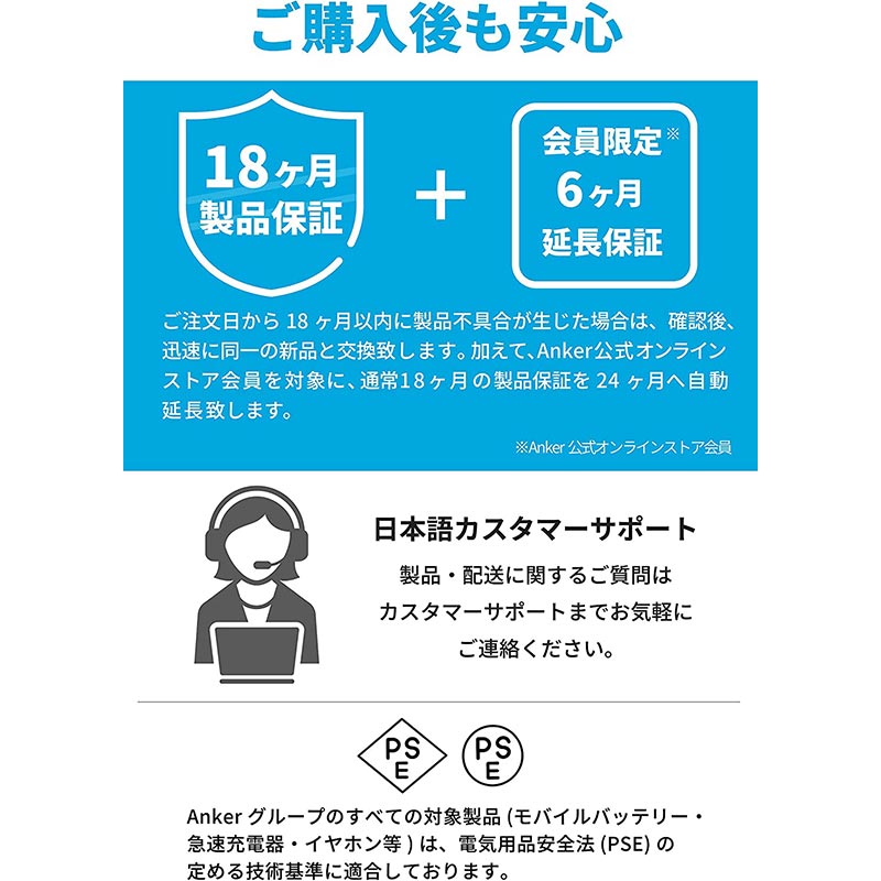 過電圧保護や電子回路のショート防止、温度管理、異物検知機能などのAnker独自の多重保護システムにより、長くお使いいただけます。