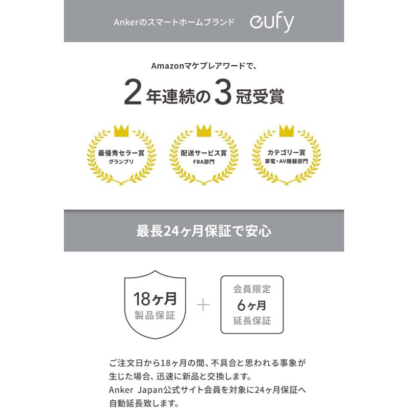 | ご注意 | ・本製品は純正のEufy Security eufyCam 2C 1-Cam Kit Cameraの増設用カメラです。本製品のご利用にはEufy Security HomeBase 2が必要です。 |