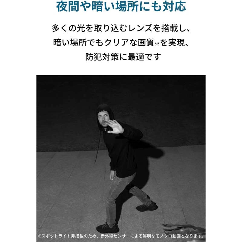 AIカメラを搭載し、人の動きを検知し自動で録画を開始でき、細かな動きも逃さずに撮影。また、人を検知した時に、Eufy Securityアプリを通じて通知します。製品仕様