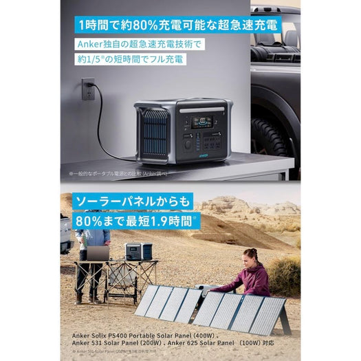スマホを約100回充電できる1,229Whの大容量、電子レンジをも動かせる1,500Wの高出力で幅広い機器を長時間ご利用いただけます。 大容量モデルにも関わらず、Anker独自の超急速充電技術により、わずか1時間で80%まで充電可能。非常時でも短時間で十分な電力を確保できます。