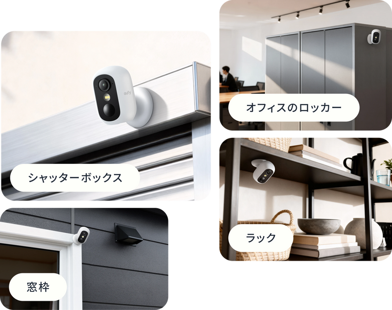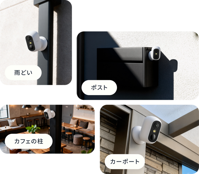 穴をあけてしっかりと設置したい場合も、専門業者による工事は一切不要。Eufyの防犯カメラは、工具と取付金具を使えば、どなたでも手軽に取り付けられます。バッテリー搭載で配線に悩む必要もなく、届いたその日からすぐに防犯対策を始められます。