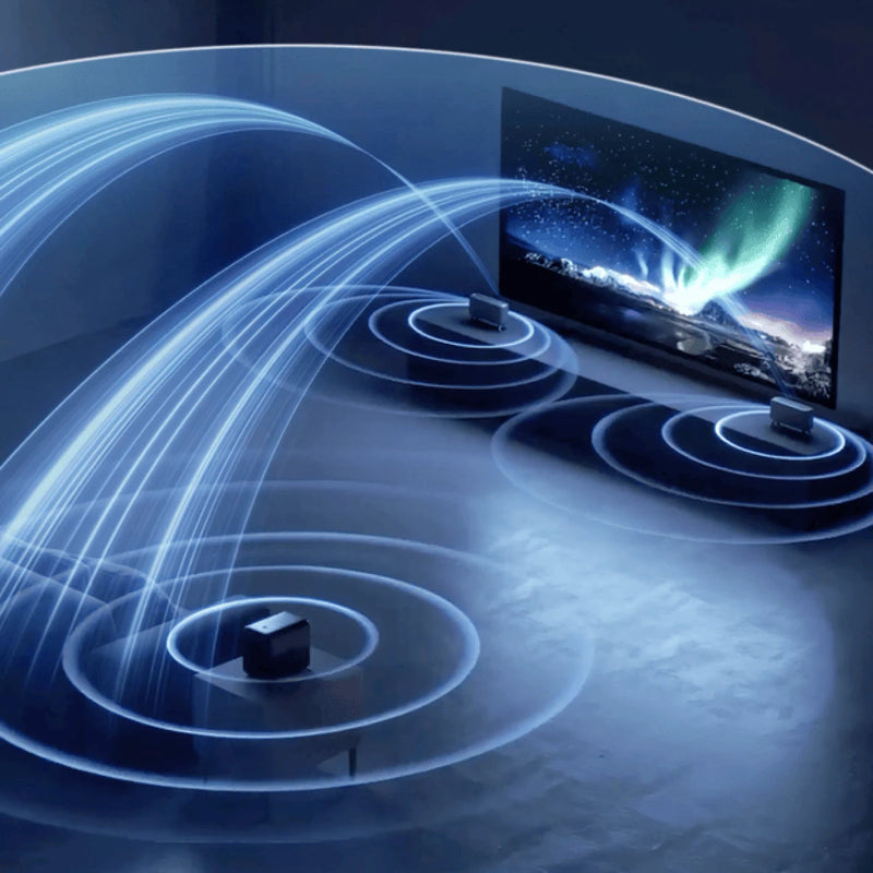 3色レーザー短焦点プロジェクターと、高音質低遅延Wi-Fiサテライトスピーカーで、最高峰の映像美と立体音響を体験できるホームシアターシステム。