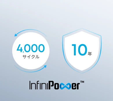 電池寿命の長さと安全性の高さが特徴のリン酸鉄リチウムイオン電池の採用に加え、独自技術により電子部品の長寿命化も実現。毎日使用しても10年間バッテリーの劣化を心配する必要がありません。
