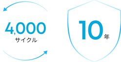 ※電池容量が初期容量の80%まで劣化するまでのサイクル回数4,000回以上、電子部品の寿命は50,000時間を誇り、適切な利用方法および環境下においては、1日1回ご利用いただいても約10年以上に渡り正常な状態を保ちます