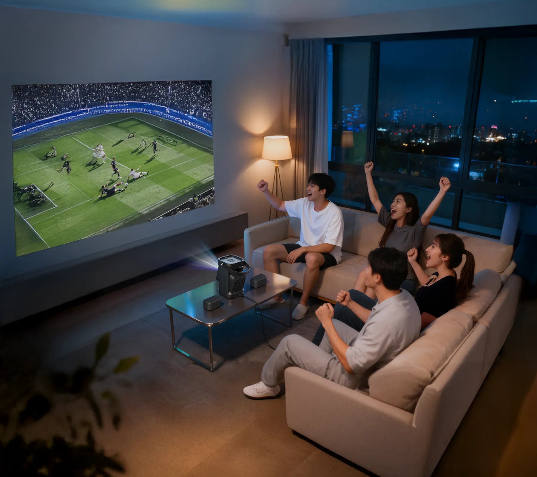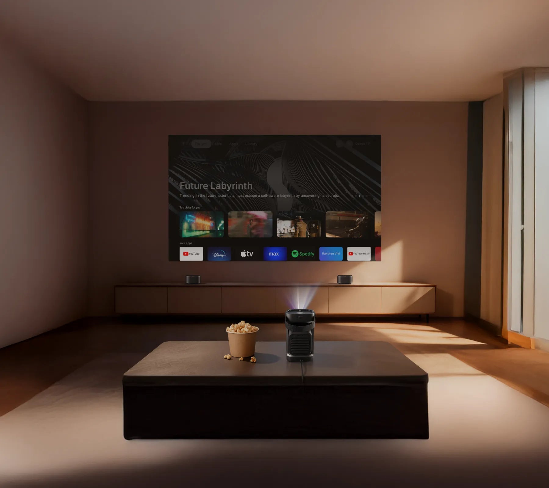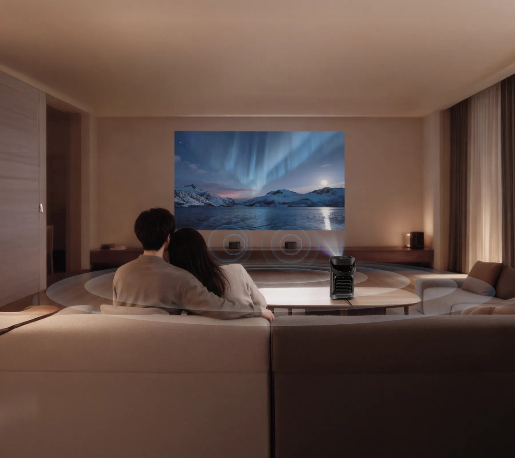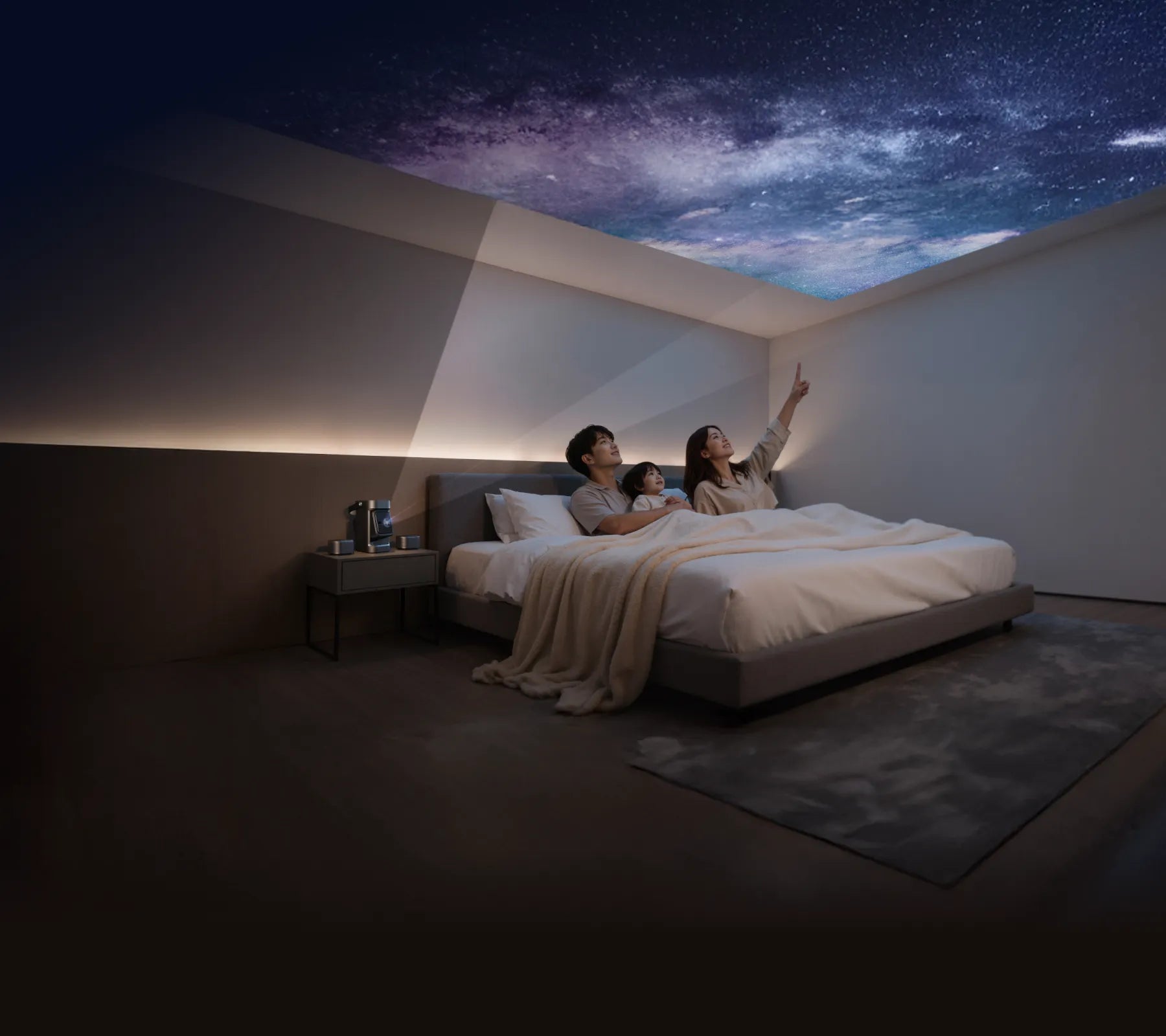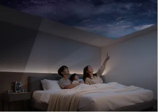 壁はもちろん、天井にも自由に投影でき、寝ながら本格的なシアター体験を実現。