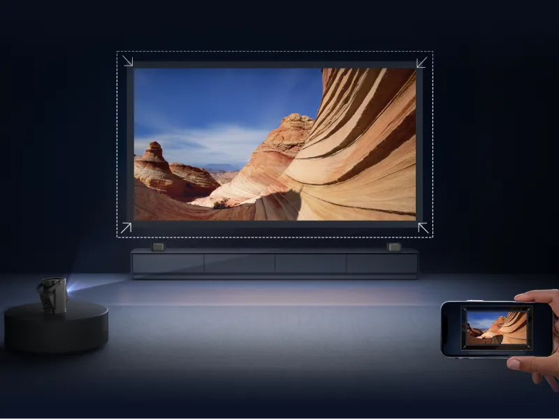 スマホを使って投影エリアをスキャンするだけで、スクリーンの位置や壁の障害物を自動で検出。映像をスクリーンにぴったり合わせたり、障害物をよけて最適な位置に調整します。