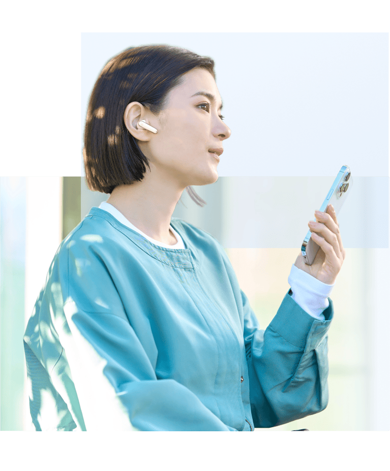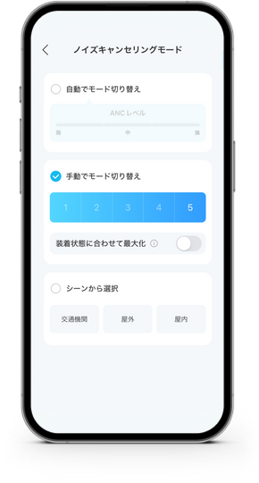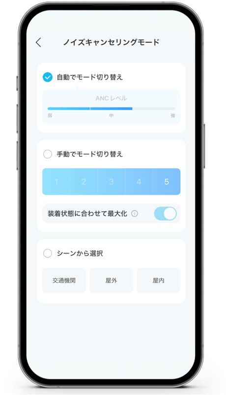 交通機関や好みの強度に合わせて、自動でも、手動でもノイズキャンセリングモードを選択可能。また、外音取り込みモードにも対応しており、駅のアナウンスや周囲の音を聞きながら音楽を楽しむことが可能です。