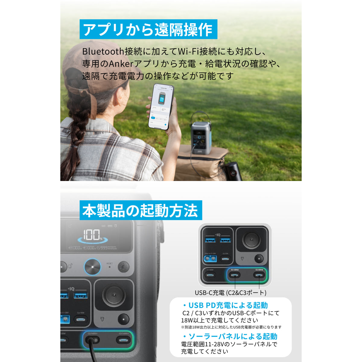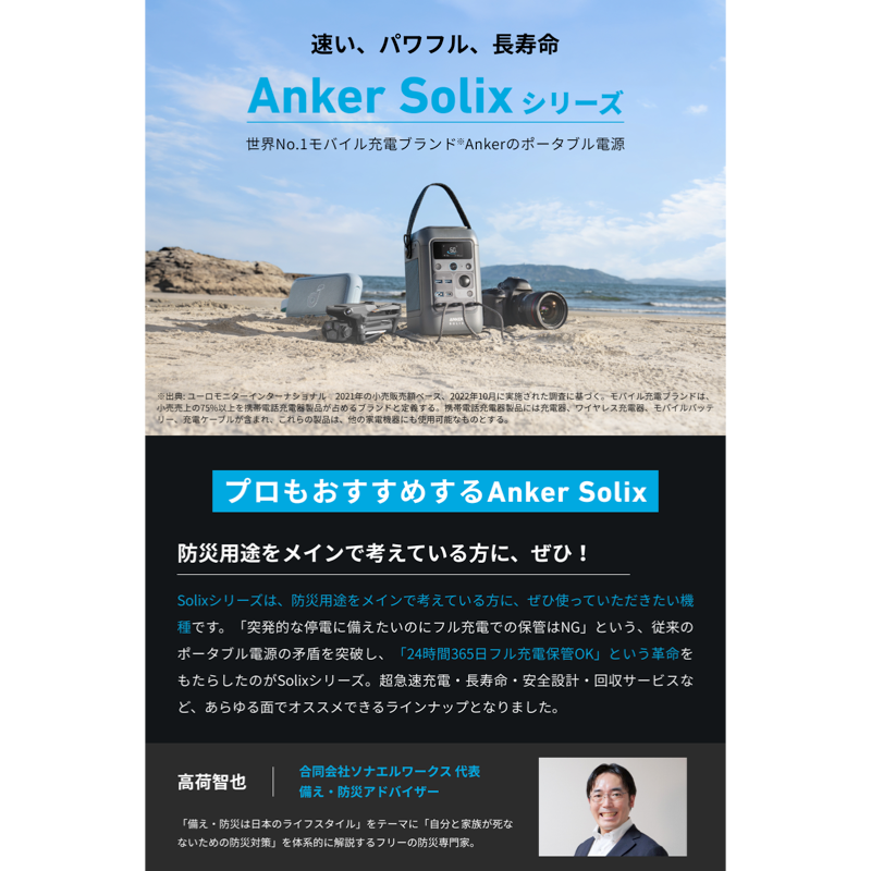 | 防水 / 防塵対応 | - | - | Anker Solix C1000 / C800 専用防塵 & 防水バッグ | Anker Solix C1000 / C800 専用防塵 & 防水バッグ | Anker Solix C1000 / C800 専用防塵 & 防水バッグ | - | Anker Solix F3800 専用防塵 & 防水カバー |