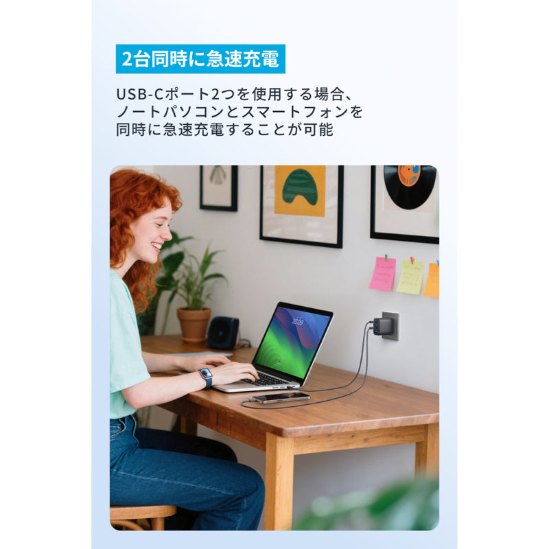 2つの USB-Cポートを同時に使用することで、ノートパソコンとスマートフォンを同時に急速充電できます