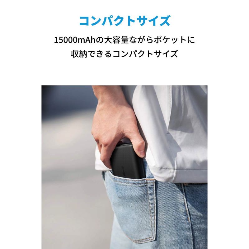 パッケージ内容 PowerCore 15000 Redux、Micro USBケーブル (USB-CケーブルとLightningケーブルは別売り) 、トラベルポーチ、取扱説明書、18ヶ月保証 + 6ヶ月 (Ankerで会員登録後) 、カスタマーサポート