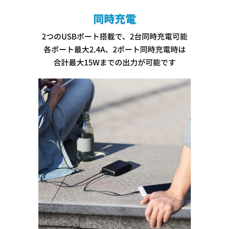 2つのUSBポート搭載で、2台同時充電が可能。各ポート最大2.4A、2ポート同時充電時は合計最大15Wまでの出力が可能です。