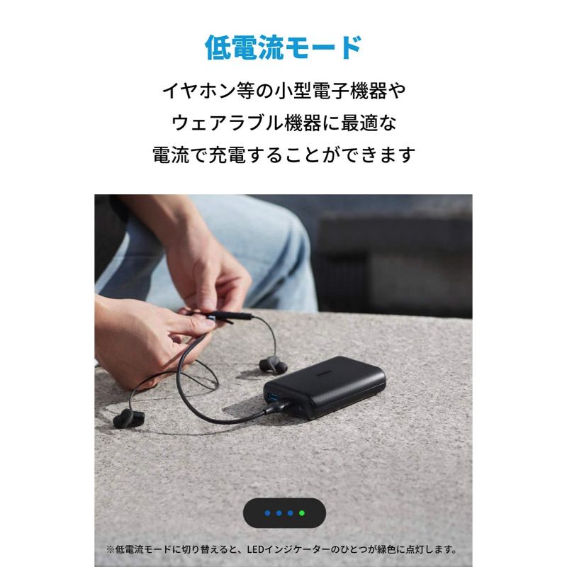 ・低電流モードに切り替えると、本体の充電残量にかかわらず、LEDインジケーターのひとつが緑色に点灯します。Bluetoothイヤホンなどを充電する際には、低電流モードを推奨します。