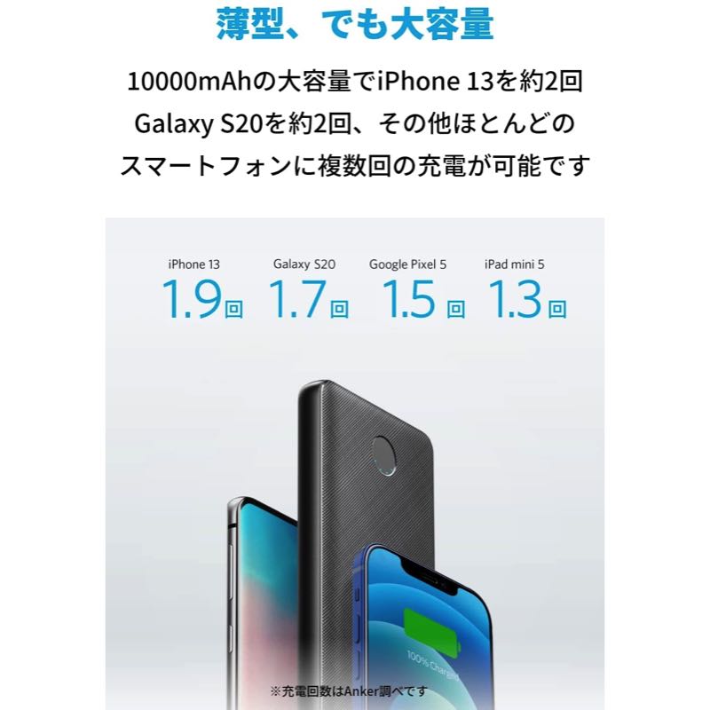 10000mAhの大容量でiPhone 13を約2回、Galaxy S20を約2回、iPad mini 5を1回以上することができます。(※充電回数はAnker調べです)USB-CとUSB-Aの2ポート搭載