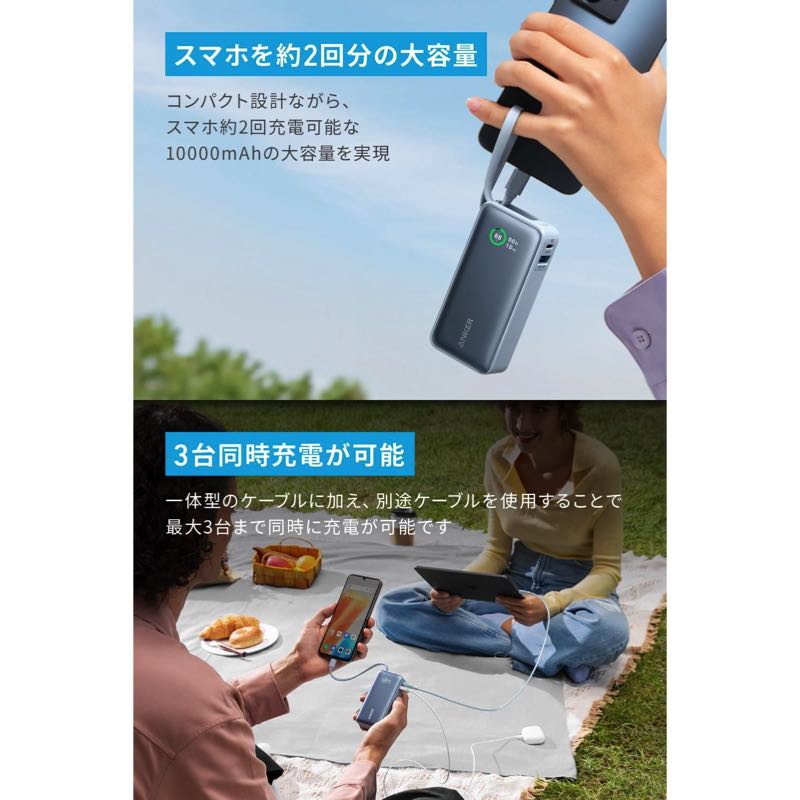 USB-Cケーブル一体型のため、ケーブルを別途持ち運ぶ必要がありません。