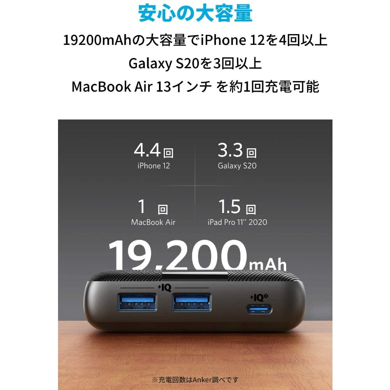 19200mAhの大容量でiPhone 12を4回以上、iPad Pro 11インチを約2回、MacBook Air 13インチを約1回満充電にすることが可能です。(※充電回数はAnker調べです)