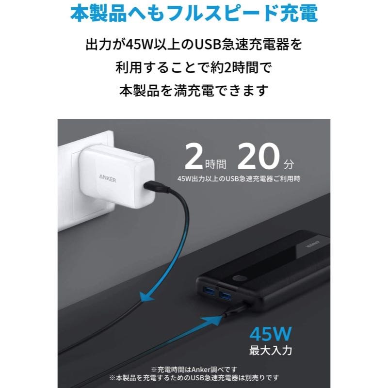 出力が45W以上のUSB急速充電器を利用することで約2時間20分で本製品を満充電できます。(※充電時間はAnker自社調べです)