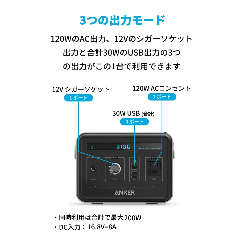 | 出力 | 【DC出力】12V=10A | 【AC出力】110V=1.09A | 【USB出力】5V=6A (各ポート最大2.4A) |