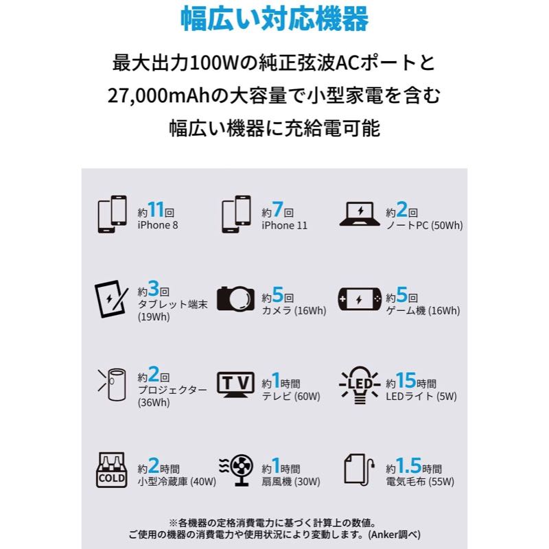 | パッケージ内容 | Anker PowerHouse 100、USB-C & USB-C ケーブル、USB-C & USB-A ケーブル、USB急速充電器、携帯用ストラップ、取扱説明書、18ヶ月保証 + 6ヶ月 (Ankerで会員登録後)、カスタマーサポート |