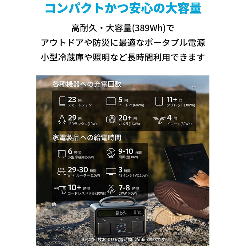 重さ約4.6kg以下の小型軽量設計で、持ち運びに便利です。約108,000mAh(389Wh)の超大容量と5通りの出力方法で、車中泊やキャンプ、旅行、野外撮影にも大活躍。 照明や小型冷蔵庫を数時間にわたり稼働できます。