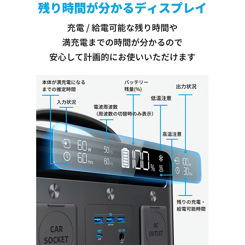 前面に大きな液晶画面を搭載し、充電 / 給電可能な残り時間など、様々な情報を確認できます。計画的な利用が可能となり、夜間の使用でも朝まで安心してお使いいただけます。