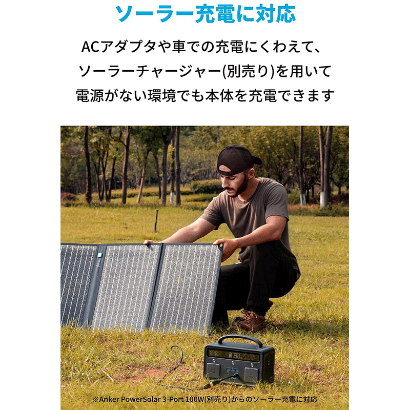 DC入力ポートはソーラー充電器 (別売り)からの入力にも対応し、コンセントのない環境でも本体を充電することが可能です。MPPT規格に対応し、より高効率なソーラー充電を実現しました。