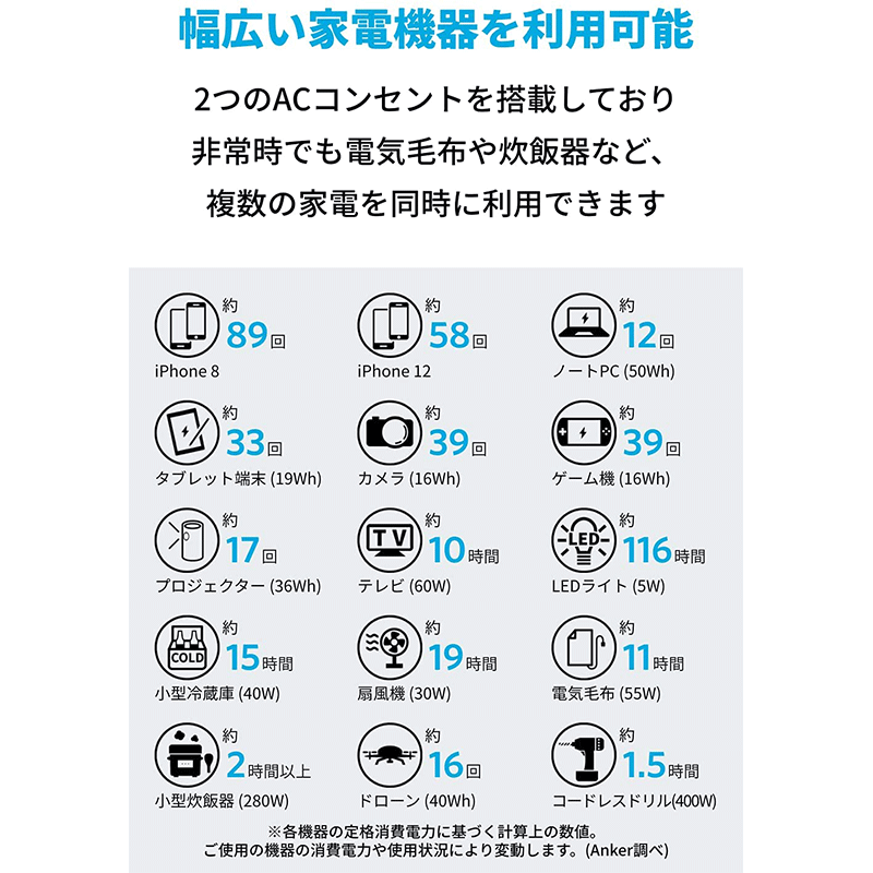 家族や友人とも一緒に使える216,000mAh (778Wh) の超大容量バッテリーで、電気毛布や小型冷蔵庫、扇風機などの小型家電をご使用いただけます。