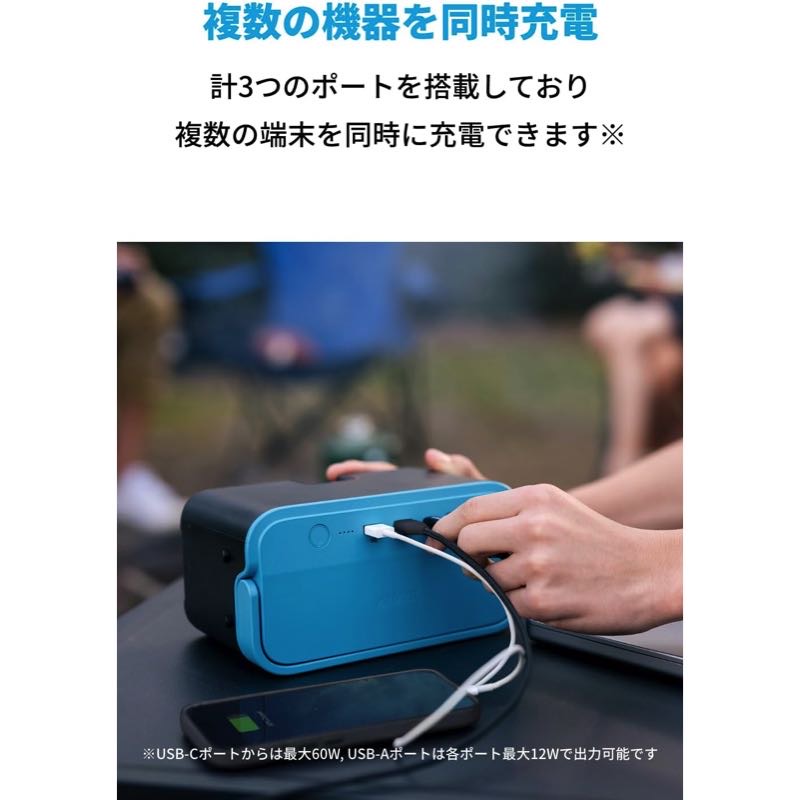 | 出力 | USB-C:最大60W (5V ⎓ 3A / 9V ⎓ 3A / 15V ⎓ 3A / 20V ⎓ 3A) USB-A:最大12W (5V ⎓ 2.4A) |