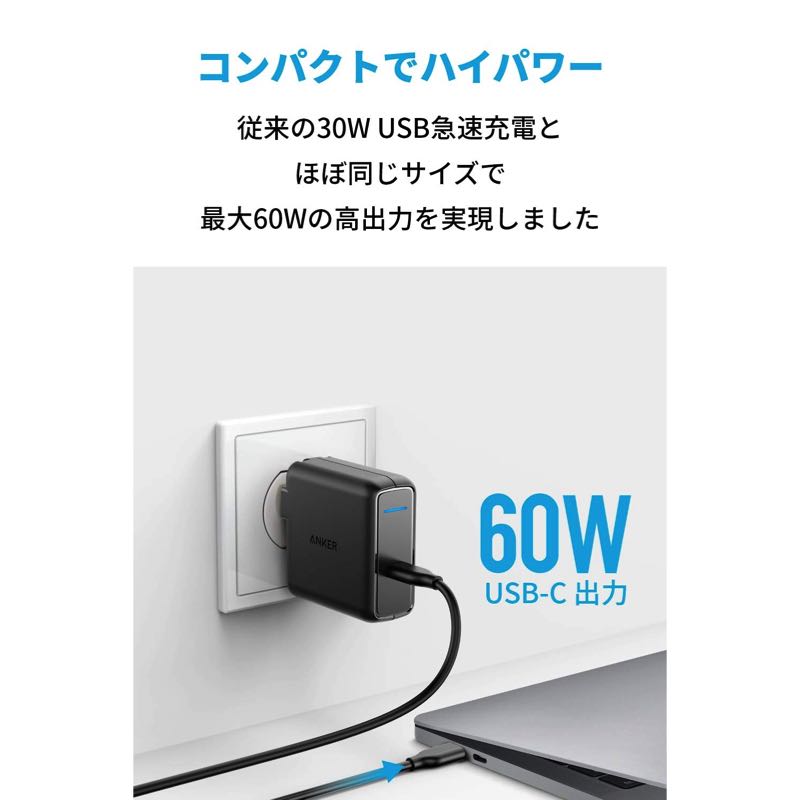従来の30W USB急速充電器とほぼ同じサイズで最大60Wの高出力を実現しました。最新のMacBook Proを含むノートパソコンなど幅広いUSB-C機器へフルスピード充電が可能です。