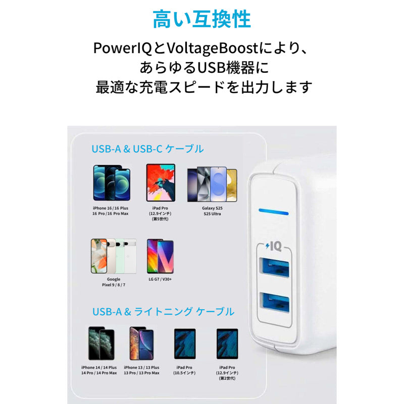 Anker独自の充電技術であるPowerIQおよびVoltageBoostを搭載し、各ポート最大2.4A出力が可能で、あらゆるUSB機器に対応しています (一般的な5W出力の充電器に比べ、充電となりますが、Power DeliveryやQuick Charge等の充電規格に対応してません)。頑丈な設計