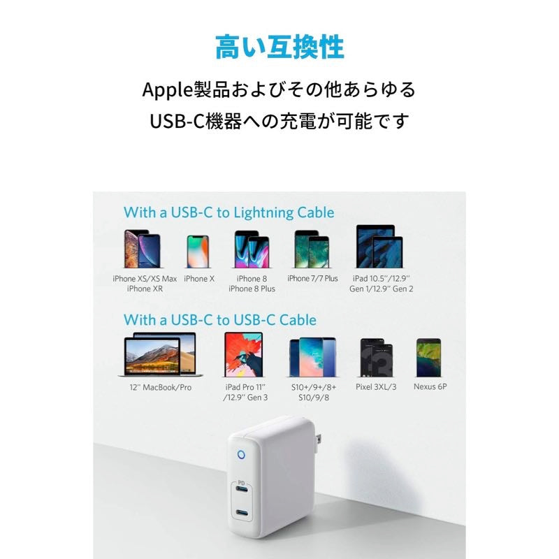 対応機種 IPhone 13 / 13 Pro / 13 mini / 13 Pro Max /12 / 12 Pro / 12 mini / 12 Pro Max / 11 / 11 Pro / 11 Pro Max / XS / XS Max / XR / X / 8 / 8 Plus, IPad Pro (2018, 12.9インチ) / iPad Pro (2018, 11インチ) / iPad Pro 10.5インチ / iPad 9.7インチ 他, MacBook Air (2018,13インチ) / MacBook 12インチ / MacBook Pro (13インチ、15インチ) , Dell XPS 13 / XPS 15 / Inspiron 13 / Inspiron 7000 他, Nexus 5X / 6P, LG G6 / G5, Pixel C / 3 / 2 / XL, Moto Z 他, ※その他使用機器との互換性確認はAnker Directカスタマーサポートへお問い合わせください, Samsung Galaxy S9 / S9+ / S8 / S8+ / Note 8 / Note 7