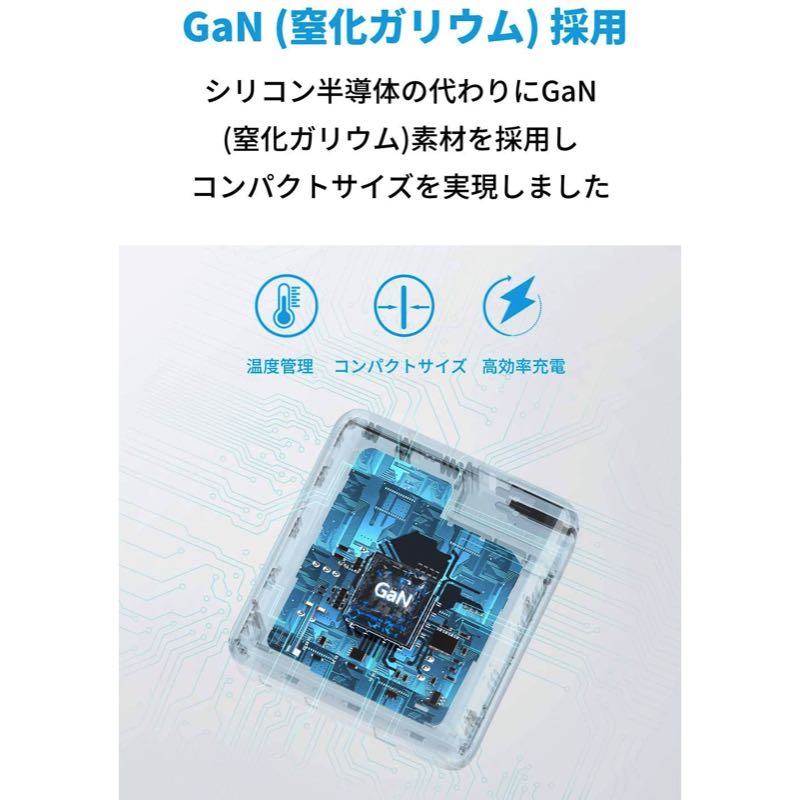 これまで使用していたシリコン半導体に代わり次世代パワー半導体素材「GaN」素材をUSB急速充電器に採用。コンパクトサイズにAnker独自の充電技術を詰め込みました。製品仕様