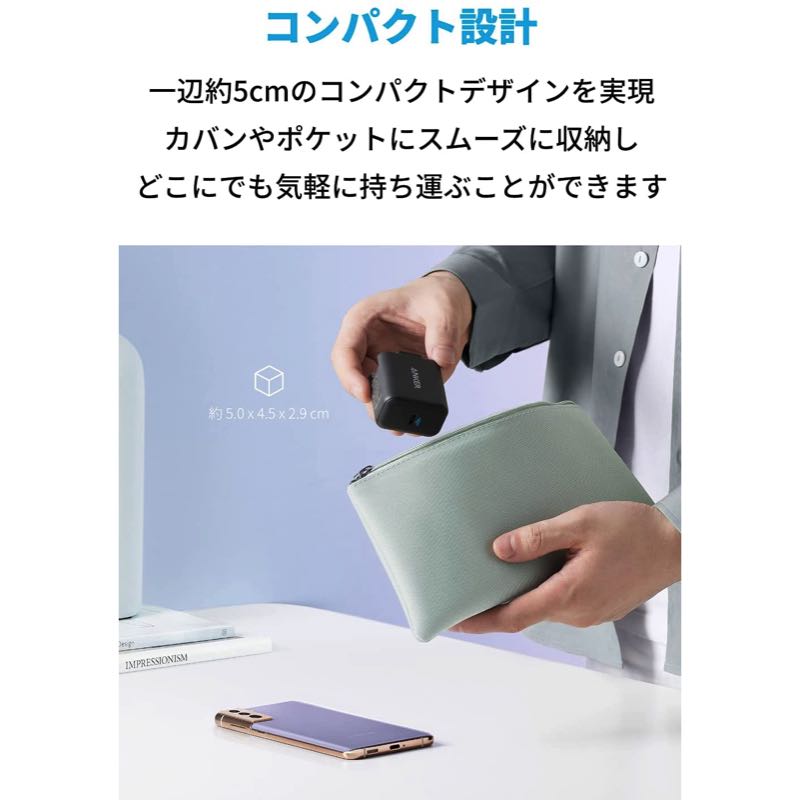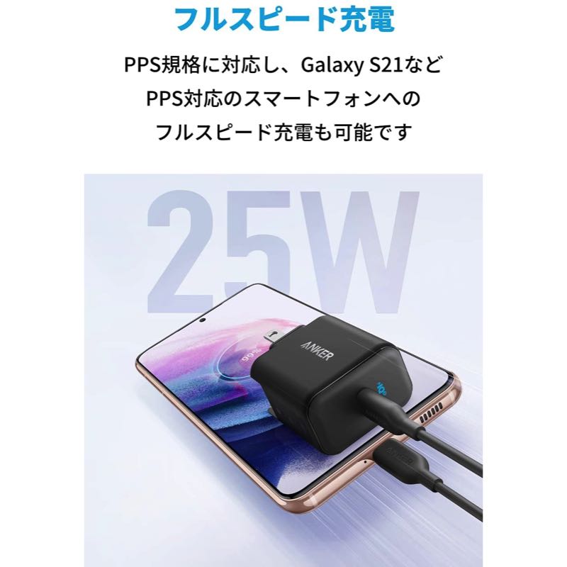 一般的な5W出力の充電器に比べ、最大3倍速く充電できます (iPhone 12を0%から30分充電した場合での比較) 。PDのオプションであるProgrammable Power Supply (PPS) 規格にも対応しておりGalaxy S21などPPS対応のスマートフォンへのフルスピード充電も可能です。折りたたみ式プラグ