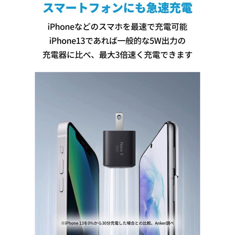 一般的な5W出力の充電器に比べ、最大3倍速く充電できます (iPhone 13を0%から50%まで充電した場合での比較) 。Programmable Power Supply (PPS) 規格にも対応しておりGalaxy S21などPPS対応のスマートフォンへの急速充電も可能です。国際的な安全規格にも準拠