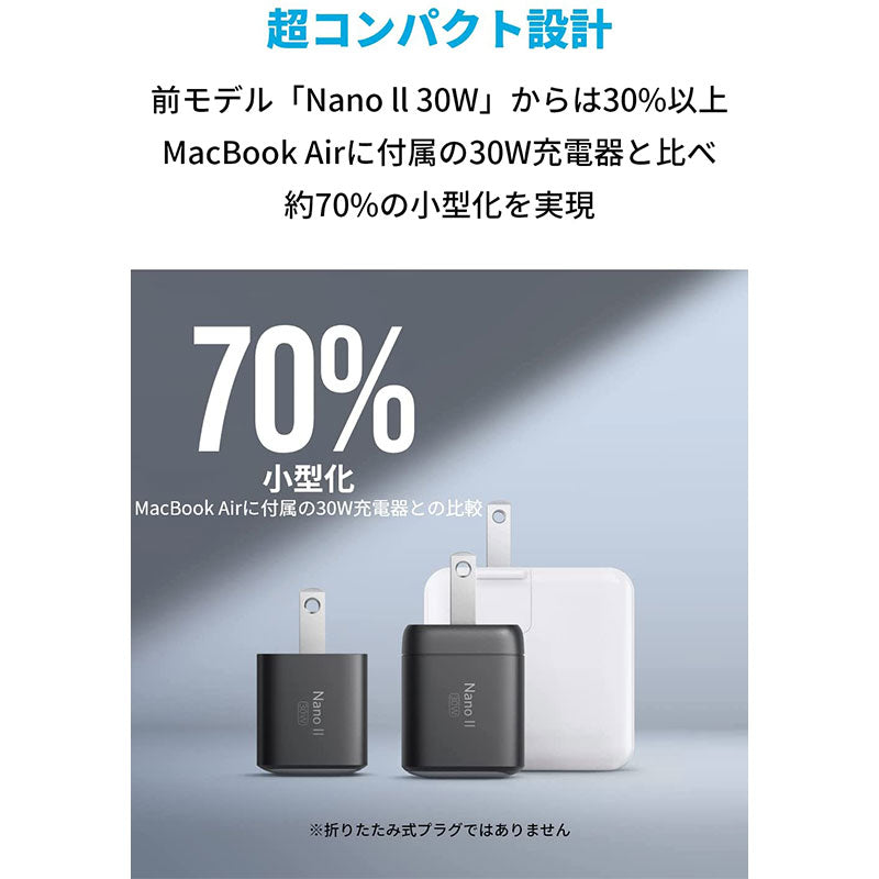USB PDに対応し、最大30W出力が可能なUSB-Cポートを搭載。スマートフォンやタブレット端末からMacBook Airまでの幅広い機器をこの1台で充電することができるため、機器毎に異なる充電器を持ち運ぶ必要はありません。独自技術「Anker GaN II」を採用