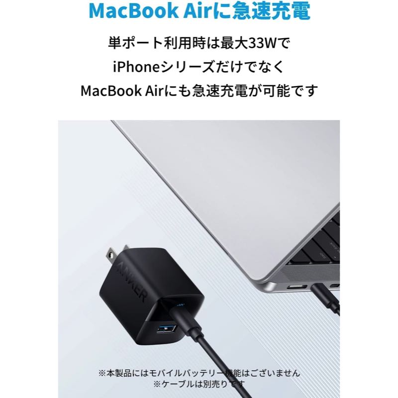 USB-CポートはUSB PDに対応し、単ポート利用時は最大33Wの出力でiPhoneやMacBook Airに急速充電が可能です (本製品にはモバイルバッテリー機能はございません) 。2台同時充電