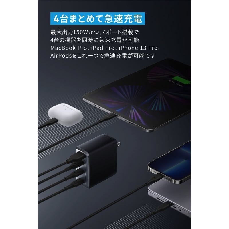 最大出力150Wかつ、4ポート搭載で4台の機器を同時に充電が可能。