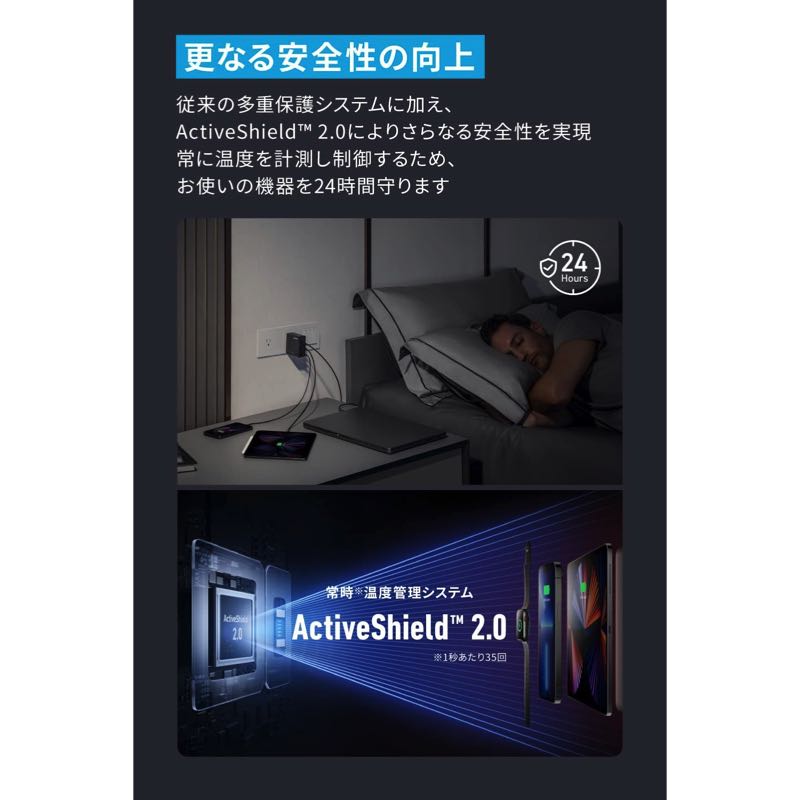Anker独自技術「GaNPrime™」を採用し、GaN搭載充電器が前シリーズから進化。超高出力 & 小型化に成功しながら複数ポートへの充電の最適配分と更なる安全性も実現しました。
