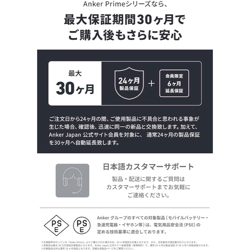 | パッケージ内容 | Anker Prime Desktop Charger (240W, 4 ports, GaN)、取扱説明書、24ヶ月保証 + 6ヶ月 (Ankerで会員登録後)、カスタマーサポート |