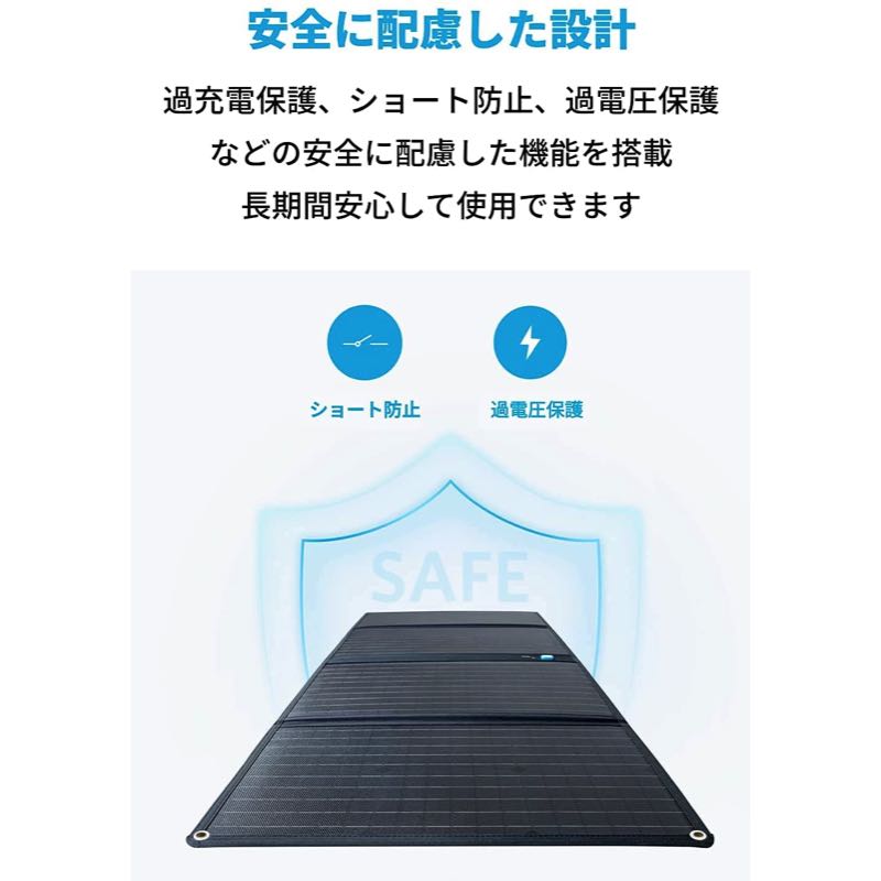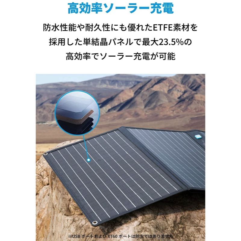 人気のポータブル電源「Anker PowerHouse II 400 / 800」(別売り) への充電に最適です。幅広い環境で使用可能な高い耐久性を実現。キャンプ等のアウトドアシーンはもちろん、停電や災害時等の電源確保が必要な際にも心強い味方です。高効率のソーラー充電