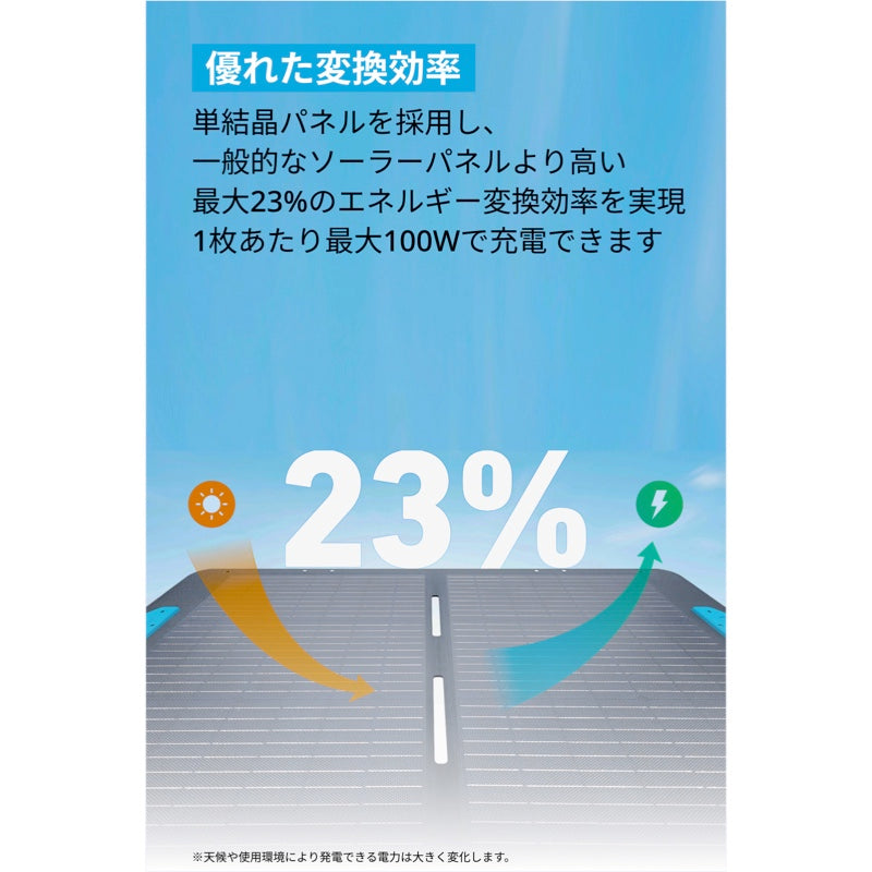 高効率な単結晶パネルを採用し、小型軽量サイズながら最大100Wの発電性能を備えます。発電から出力間の電力ロスが発生するため、理想的な晴天時において、ポータブル電源を約85W (※) で充電できます。(※Anker 521のように、ポータブル電源の最大入力値が65Wの場合はソーラーパネルからの入力も65W以下になります)