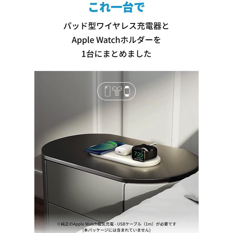 パッド型ワイヤレス充電器とApple Watchホルダーを1台にまとめました。※純正のApple Watch磁気充電・USBケーブル (1m) が必要です。 (本パッケージには含まれていません)