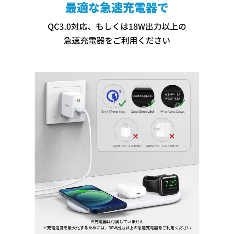 | パッケージ内容 | Anker PowerWave+ 3-in-1 stand with Watch Holder、USB-A & USB-C ケーブル (約1.5m) 、取扱説明書、クイックスタートガイド、18ヶ月保証 + 6ヶ月 (Ankerで会員登録後) 、カスタマーサポート | ||
