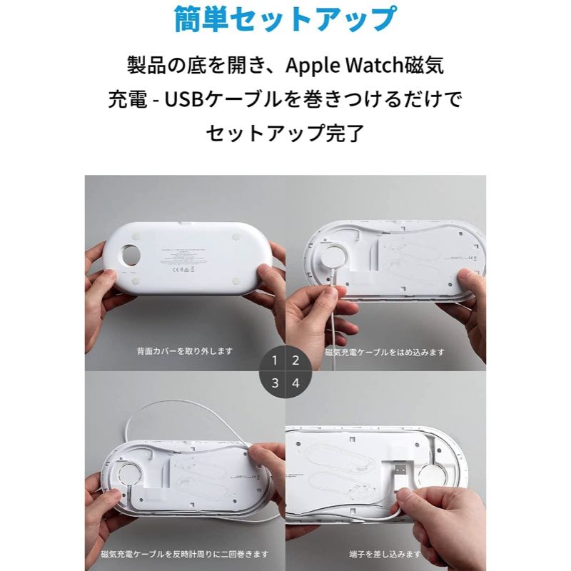 製品の底を開き、Apple Watch磁気充電USBケーブルを巻きつけるだけでセットアップが完了します。 (※純正のApple Watch磁気充電ケーブル (1m) にのみ対応しています。)ケースはそのままで