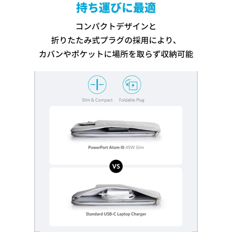 | パッケージ内容 | Anker PowerPort Atom III 45W Slim、取扱説明書、18ヶ月保証 + 6ヶ月 (Ankerで会員登録後)、カスタマーサポート |