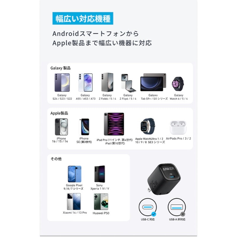 | パッケージ内容 | Anker Charger (25W) 、取扱説明書、18ヶ月保証 + 6ヶ月 (Ankerで会員登録後) 、カスタマーサポート |