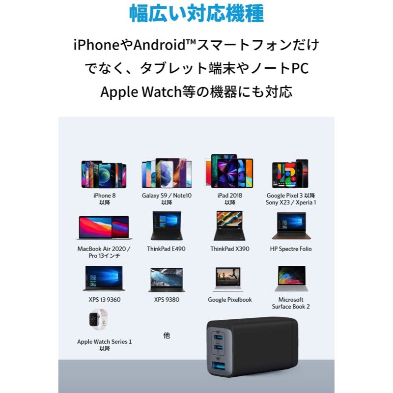 | 対応機種 | スマートフォン - iPhone 15 / 15 Plus / 15 Pro / 15 Pro Max / 14 / 14 Plus / 14 Pro / 14 Pro Max / iPhone 13 / 13 mini / 13 Pro / 13 Pro Max / 12 / 12 mini / 12 Pro / 12 Pro Max / 11 / 11 Pro / 11 Pro Max / SE (第2世代) / XS / XS Max / XR / X / 8 / 8 Plus 他 - Galaxy S21 / S21+ / S21 Ultra / S20 / S20+ / S20 Ultra / S10 / S10+ / S10e / S9 / S9+ / S8 / S8+ / Note20 / Note20 Ultra / Note10+ / Note 10 / Note 9 / Note 8 / Note 7 他 - Pixel 6 / 5 / 4 / 4 XL / 3 / 3 XL 他 タブレット端末 - iPad (第9世代) / iPad Air (第4世代) / iPad Pro (12.9インチ) (第5世代) / iPad Pro (11インチ) (第3世代) / iPad mini (第6世代) 他 ノートPC - MacBook Air (M1、2020) / Air (Retinaディスプレイ、13インチ、2020) / Pro (13インチ、M1、2020) / Pro (14インチ、2021) / Pro (16インチ、2021) 他 - Dell XPS 15 / XPS 13 / Inspiron 15 / Inspiron 14 他 - Lenovo ThinkPad X1 / X390 / E490 / IdeaPad Slim 550 / IdeaPad Flex 550 他 - HP EliteBook x360 / Spectre x2 12インチ / Spectre x360 2019 / Spectre Folio / Pavilion 15-eg / Pavilion 14-dv 他 - NEC LAVIE VEGA / LAVIE Pro Mobile / LAVIE Note Mobile / LAVIE First Mobile 他 - Huawei MateBook 13 / MateBook X / MateBook X Pro 2019 他 - その他USB Power Delivery対応のノートPCに幅広く対応しています その他対応機種 - Apple Watch 他 |