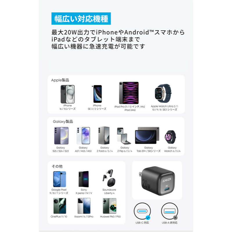 最大20W出力で、GalaxyなどのAndroidスマートフォンからiPhoneやiPadなどApple製品まで、幅広い機器に急速充電が可能です。