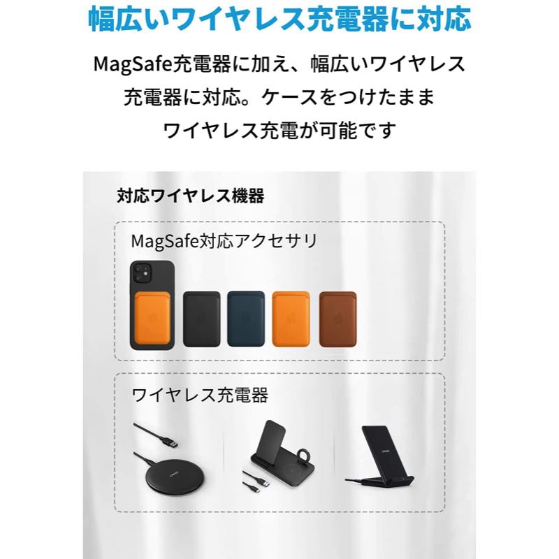 MagSafe充電に加え、幅広いワイヤレス充電器に対応。ケースをつけたままお使いのワイヤレス充電器でワイヤレス充電が可能です。